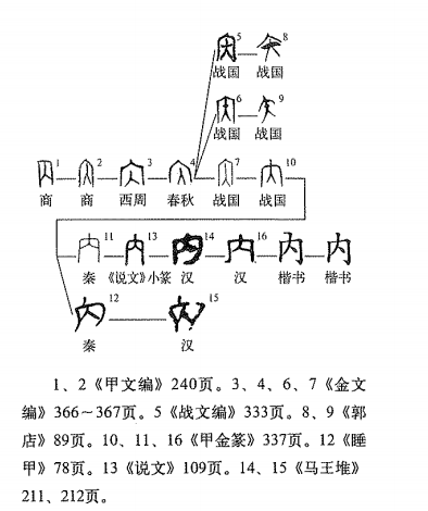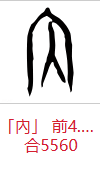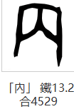字的上半是一间屋子状;下半是“入”,本义是从外面进入内里。后逐渐分化为“内”“入”“纳”三词,但在西周中期以前“内”字还兼赅“内”“入”“纳”三项相关联的意义。