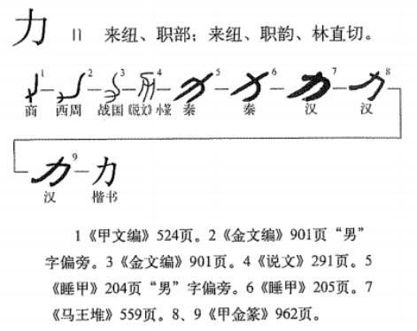 力 甲骨文字形 “力”的甲骨文字形 “力”字典中的甲骨文字形 “力”龟甲兽骨上的形态 “力”《字源》中的字形演变 字理阐发 象形字。像耒(一种原始农具)之形,长的一笔像其柄,短的一笔像其铲(即“耜”)(见下图)。字形的变化主要是像铲的那一曲笔(小篆分三笔写)逐渐上移,成为现代汉字“力”字的第一笔,而像耒柄的那一笔则变成“力”的第二笔。“力”本像耒形,而来耕须用力,故引申为气力之“力”,这个意义成为此字的常用义。 字理教学 利用甲骨字形进行讲解,展示农具之形如逐渐抽象为如今的汉字字形,理解中华汉字的象形艺术,并与“田”、“男”、“众”等字一齐拓展中国农业文化。