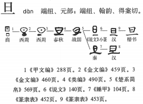“旦”古字象日从地平线上露出还没脱离之形,所以“旦”是夜的结束,昼的开始;和“旦”相对的是“夕”,是月出,这是宵与昼、日与夜的分界线。“旦”是时间,是太阳冒山之时。注意,因为古人以日出为一日的正式开始,所以当天说“旦日”,在时间上来说相当于明日的日出时分,古代习惯以之称明日。