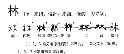 林 甲骨文字形 “林”的甲骨文字形 “林”字典中的甲骨文字形 “林”龟甲兽骨上的形态 “林”《字源》中的字形演变 字理阐发 甲骨文为会意字。从二木,表示丛聚的树木。本义是连接成片的树木。也比喻聚集在一起的人或事物。 字理教学 与“木”“森”共同讲解,二木成林,三木成森,让学生感受汉字造字的会意法门。