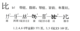 另一说为,甲骨文的“比”从二“匕”,“匕”在古代为一种长柄浅勺、勺柄稍锐的取食器具的象形文,排比二“匕”成字,表示本义为相邻并、靠得近,同时“匕”也提示该字的读音。该说法没有第一种说法流传广。