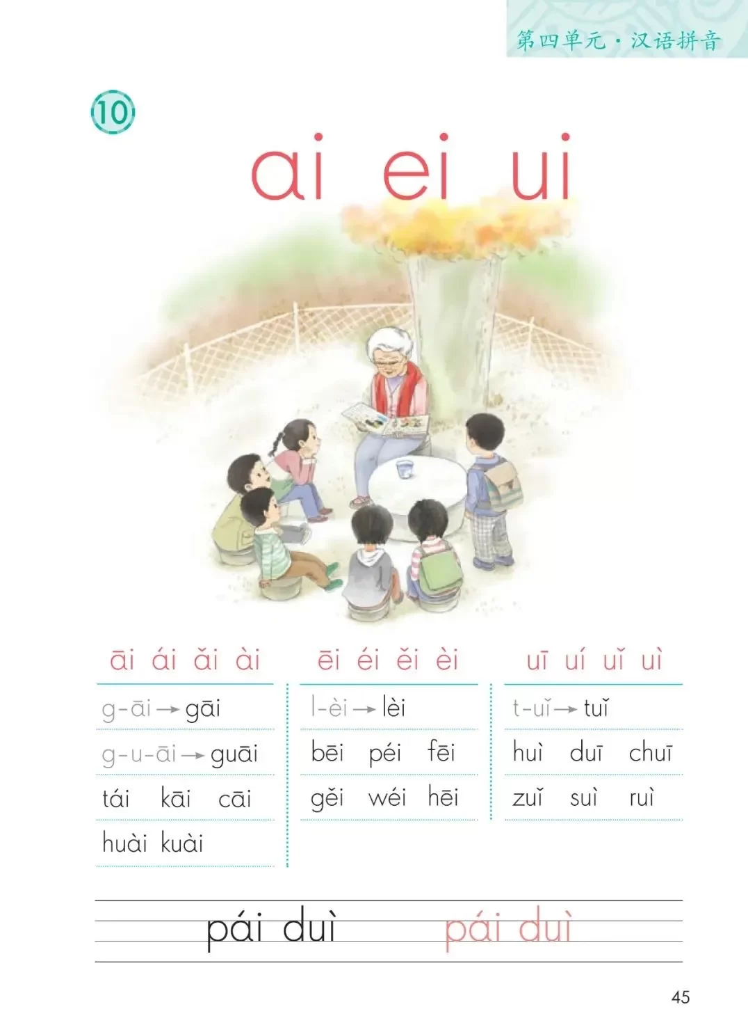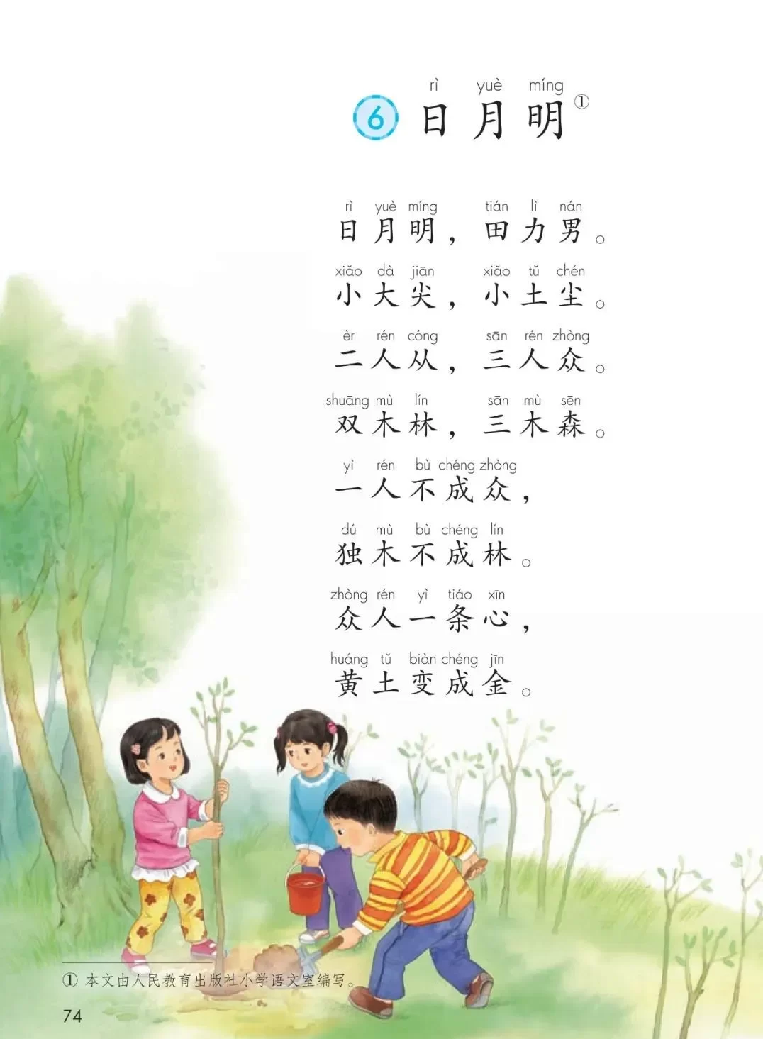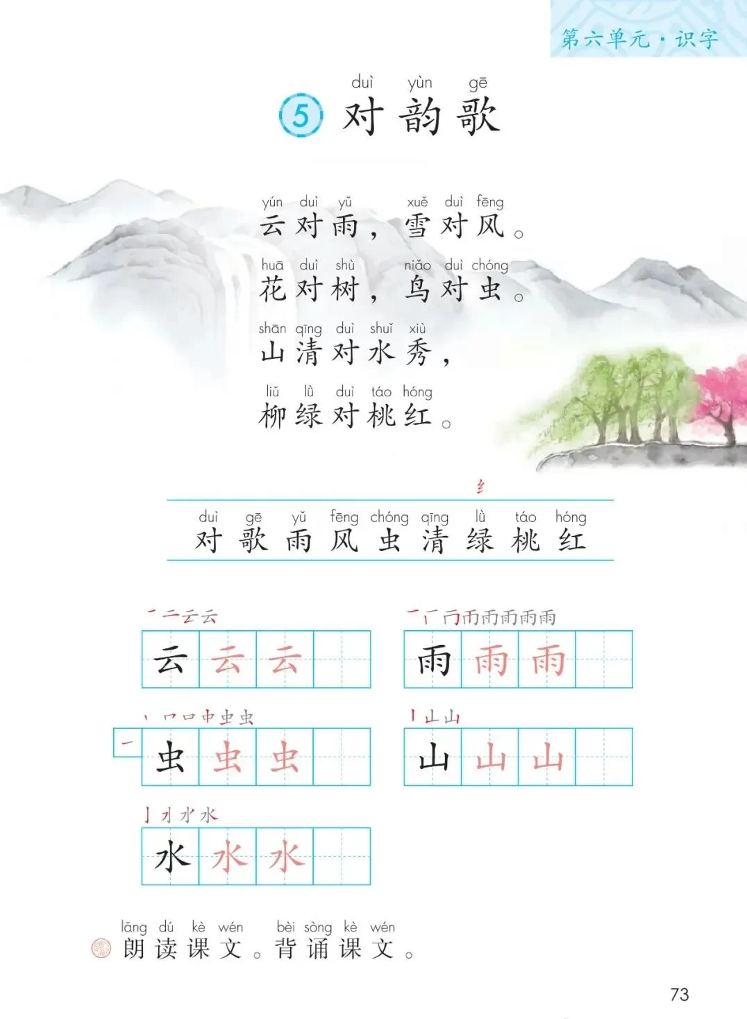 语文一年级 上册 人教版 第一单元 · 识字 第一课 天地人 去学习 第二课 金木水火土 去学习 第三课 口耳目手足 去学习 第四课 日月山川 去学习 语文园地一 第二单元 · 汉语拼音 第一课 a o e 没有生字 第二课 i u ü 没有生字 第三课 b p m f 去学习 第四课 d t n l 去学习 语文园地二 第三单元 · 汉语拼音 第五课 g k h 去学习 第六课 j q x 去学习 第七课 z c s 去学习 第八课 zh ch sh r 去学习 第九课 y w 去学习 语文园地三 第四单元 · 汉语拼音 第十课 ai ei ui 去学习 第十一课 ao ou iu 去学习 第十二课 ie üe er 去学习 第十三课 an en in un ün 去学习 第十四课 ang eng ing ong 去学习 语文园地四 第五单元 · 阅读 第一课 秋天 去学习 第二课 江南 去学习 第三课 雪地里的小画家 去学习 第四课 四季 去学习 语文园地五 第六单元 · 识字 第五课 对韵歌 去学习 第六课 日月明 去学习 第七课 小书包 去学习 第八课 升国旗 去学习 语文园地六 第七单元 · 阅读 第五课 小小的船 去学习 第六课 影子 去学习 第七课 两件宝 去学习 语文园地七 第八单元 · 阅读 第八课 比尾巴 去学习 第九课 乌鸦喝水 去学习 第十课 雨点儿 去学习 语文园地八