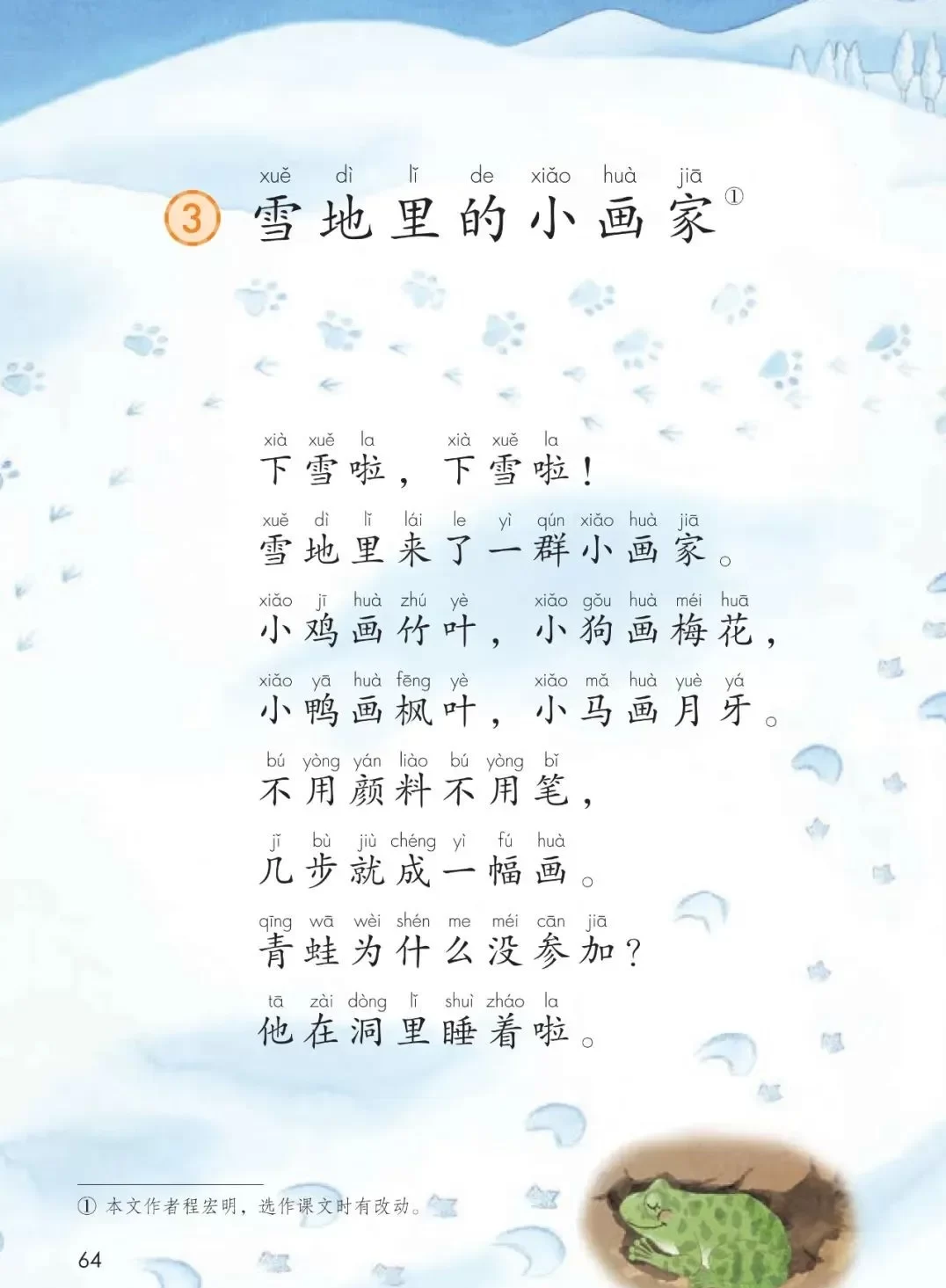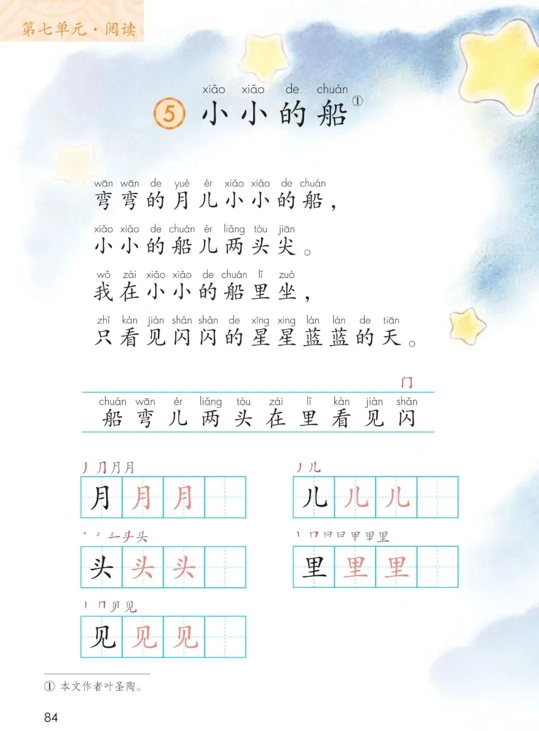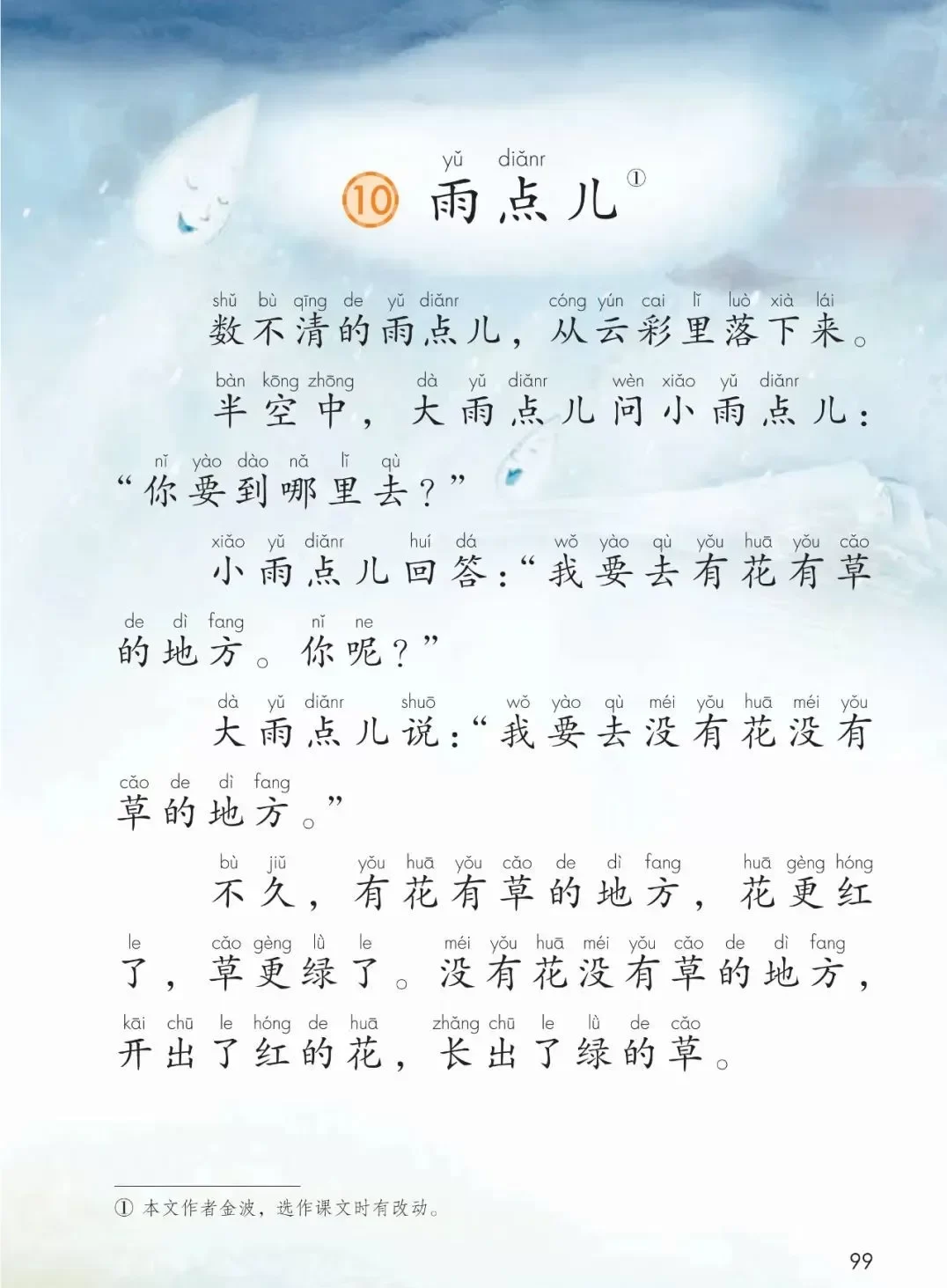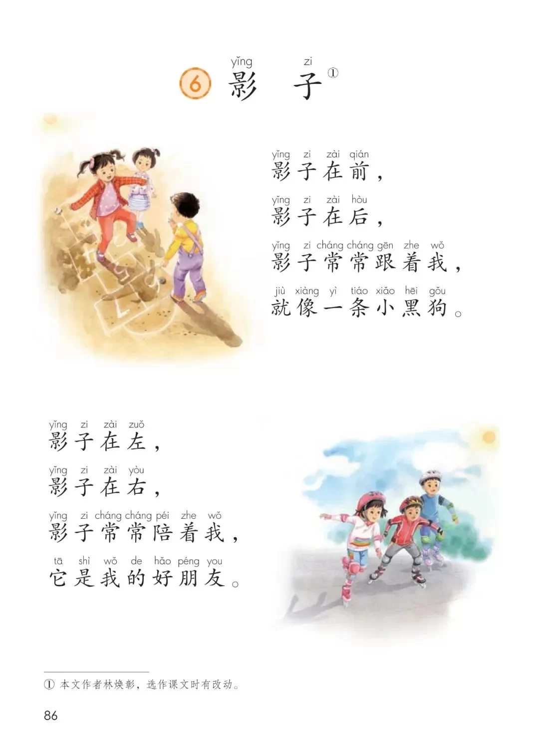 语文一年级 上册 人教版 第一单元 · 识字 第一课 天地人 去学习 第二课 金木水火土 去学习 第三课 口耳目手足 去学习 第四课 日月山川 去学习 语文园地一 第二单元 · 汉语拼音 第一课 a o e 没有生字 第二课 i u ü 没有生字 第三课 b p m f 去学习 第四课 d t n l 去学习 语文园地二 第三单元 · 汉语拼音 第五课 g k h 去学习 第六课 j q x 去学习 第七课 z c s 去学习 第八课 zh ch sh r 去学习 第九课 y w 去学习 语文园地三 第四单元 · 汉语拼音 第十课 ai ei ui 去学习 第十一课 ao ou iu 去学习 第十二课 ie üe er 去学习 第十三课 an en in un ün 去学习 第十四课 ang eng ing ong 去学习 语文园地四 第五单元 · 阅读 第一课 秋天 去学习 第二课 江南 去学习 第三课 雪地里的小画家 去学习 第四课 四季 去学习 语文园地五 第六单元 · 识字 第五课 对韵歌 去学习 第六课 日月明 去学习 第七课 小书包 去学习 第八课 升国旗 去学习 语文园地六 第七单元 · 阅读 第五课 小小的船 去学习 第六课 影子 去学习 第七课 两件宝 去学习 语文园地七 第八单元 · 阅读 第八课 比尾巴 去学习 第九课 乌鸦喝水 去学习 第十课 雨点儿 去学习 语文园地八